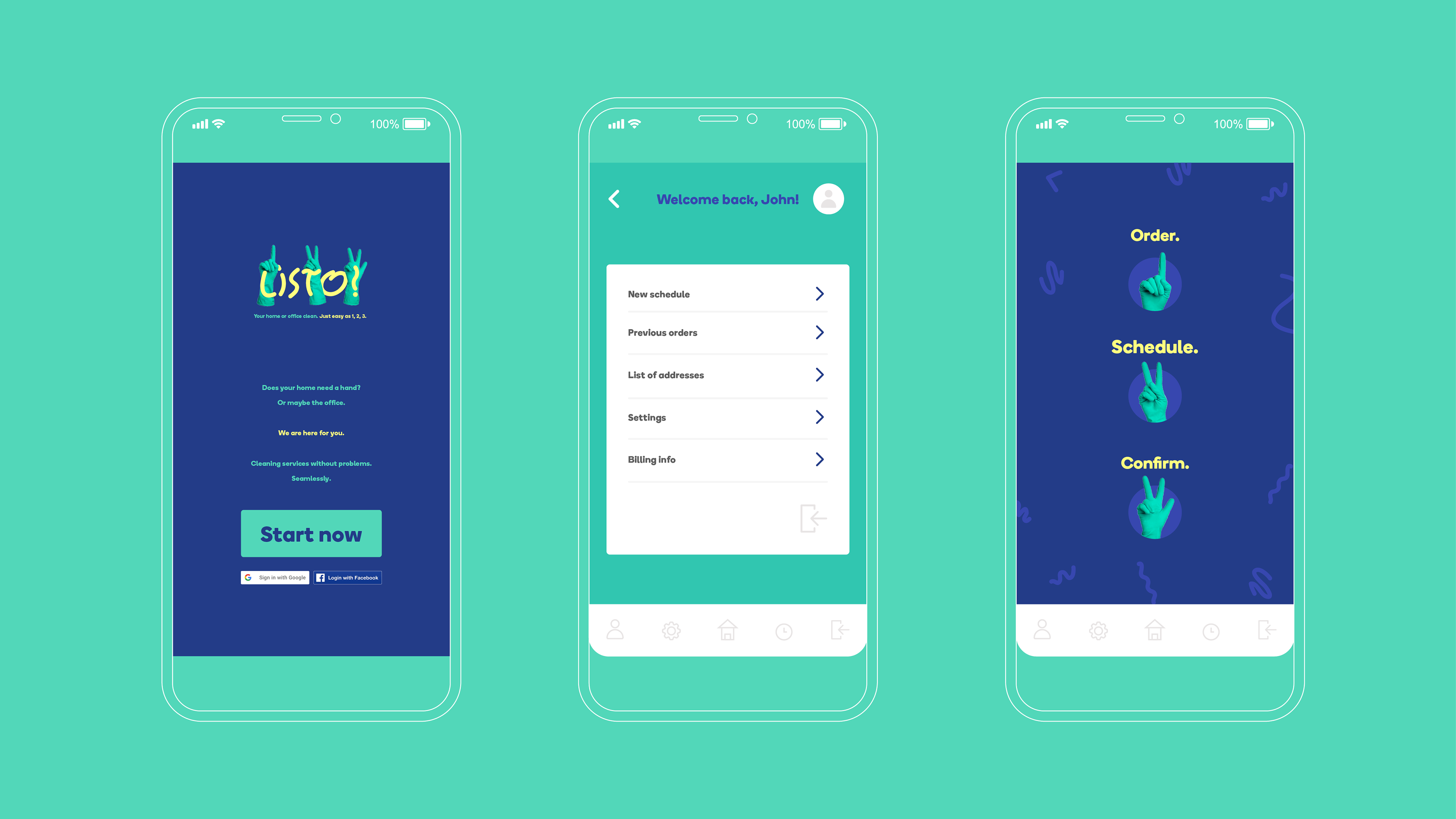 Brand identity for 'Listo!', a star up company for app-driven cleaning services for homes and offices.